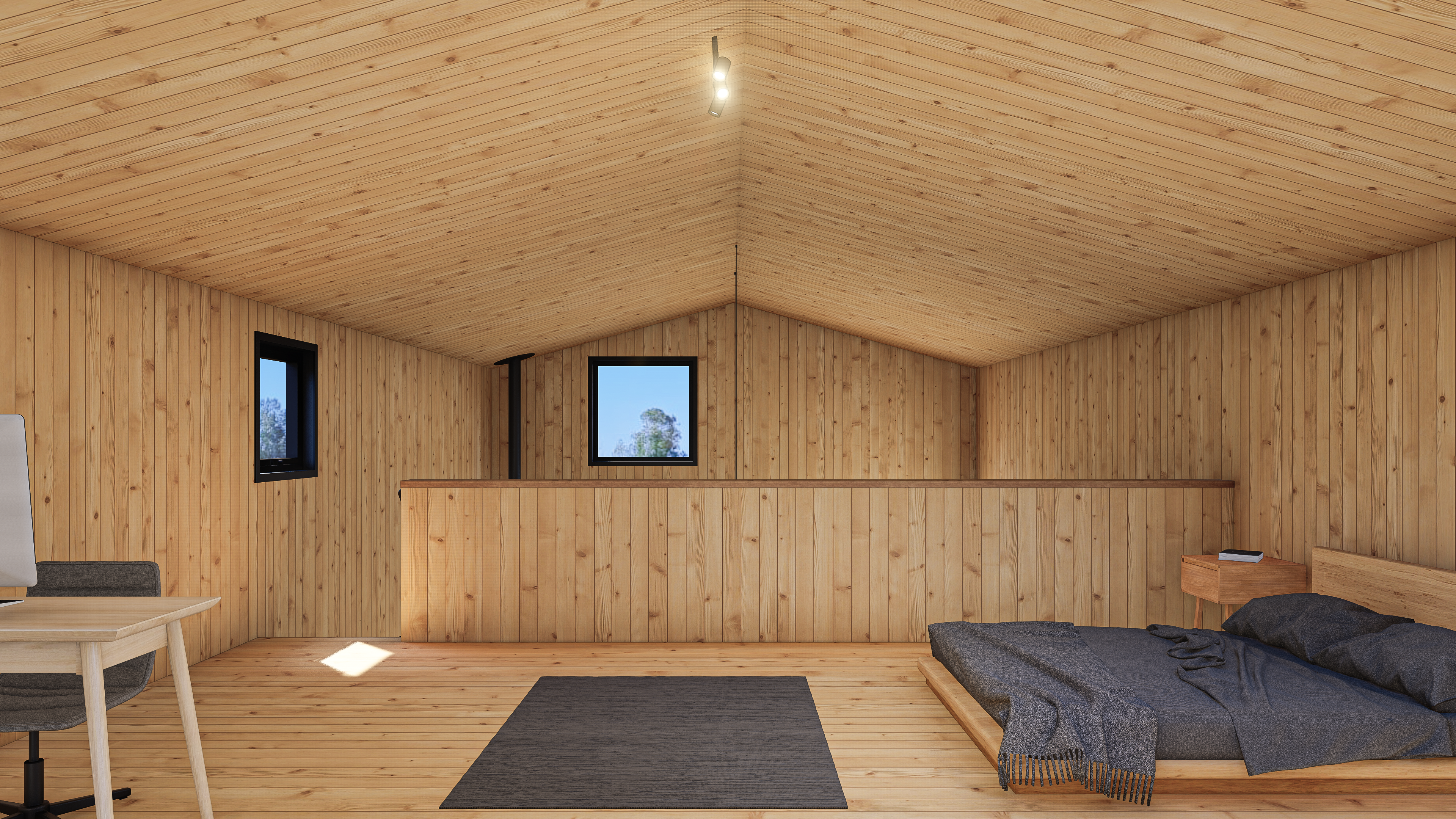 Este diseño está compuesto por 1 dormitorio en altillo, 1 baño, bodega, espacio multifunciónal y cocina.