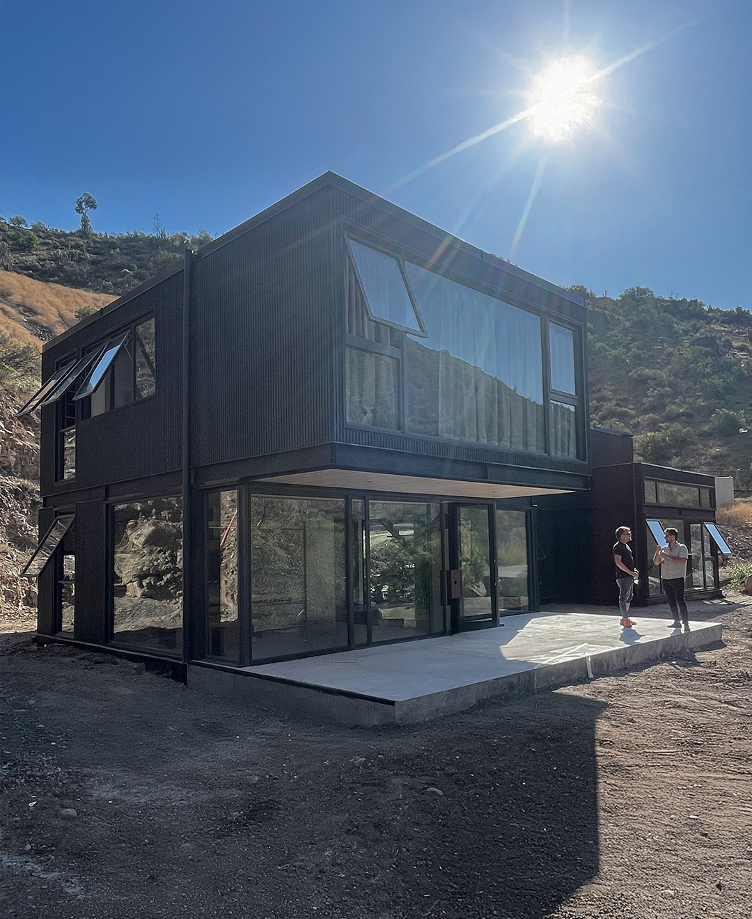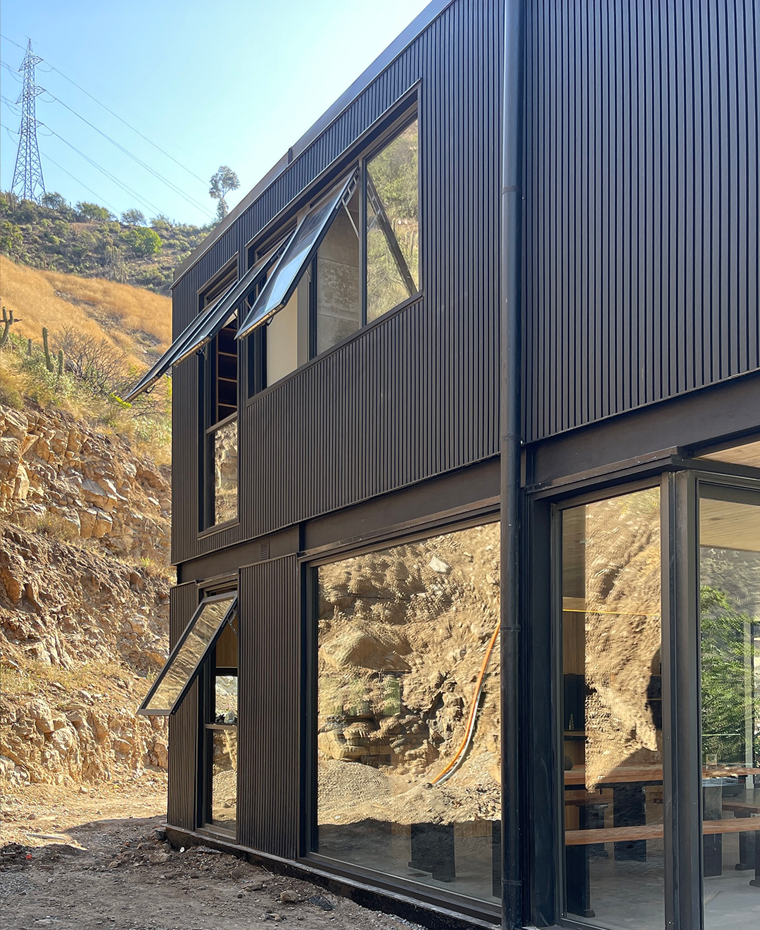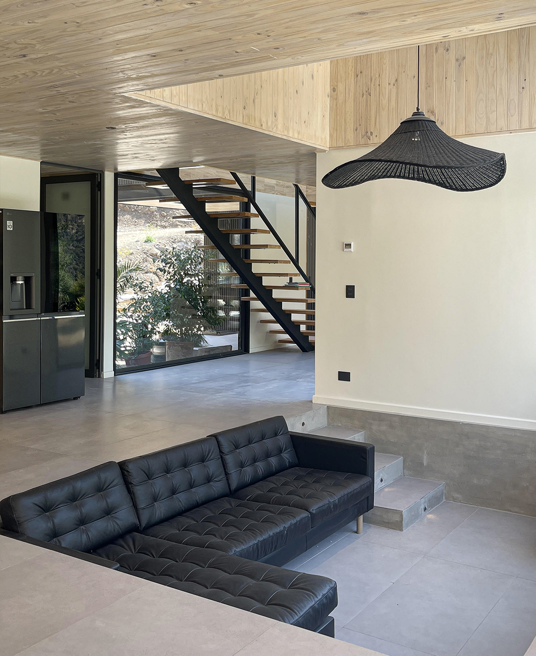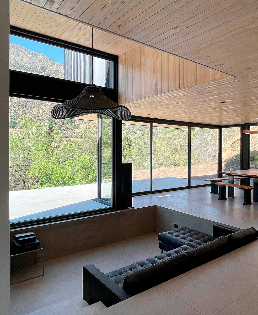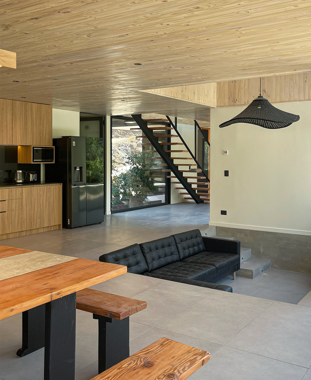 Las grandes ventanas enmarcan las vistas y conectan la vida interior con el entorno, mientras la doble altura y la escalera liviana refuerzan la sensación de amplitud. El resultado es una vivienda de lenguaje contemporáneo, precisa en su composición y pensada para habitar el paisaje de manera directa.