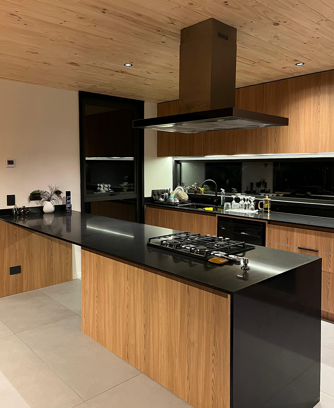 El proyecto propone una arquitectura de líneas limpias y materialidad contenida, donde la envolvente oscura contrasta con un interior cálido revestido en madera. En el primer nivel, cocina, comedor y estar se integran en un espacio continuo, marcado por un living hundido que aporta carácter y profundidad.