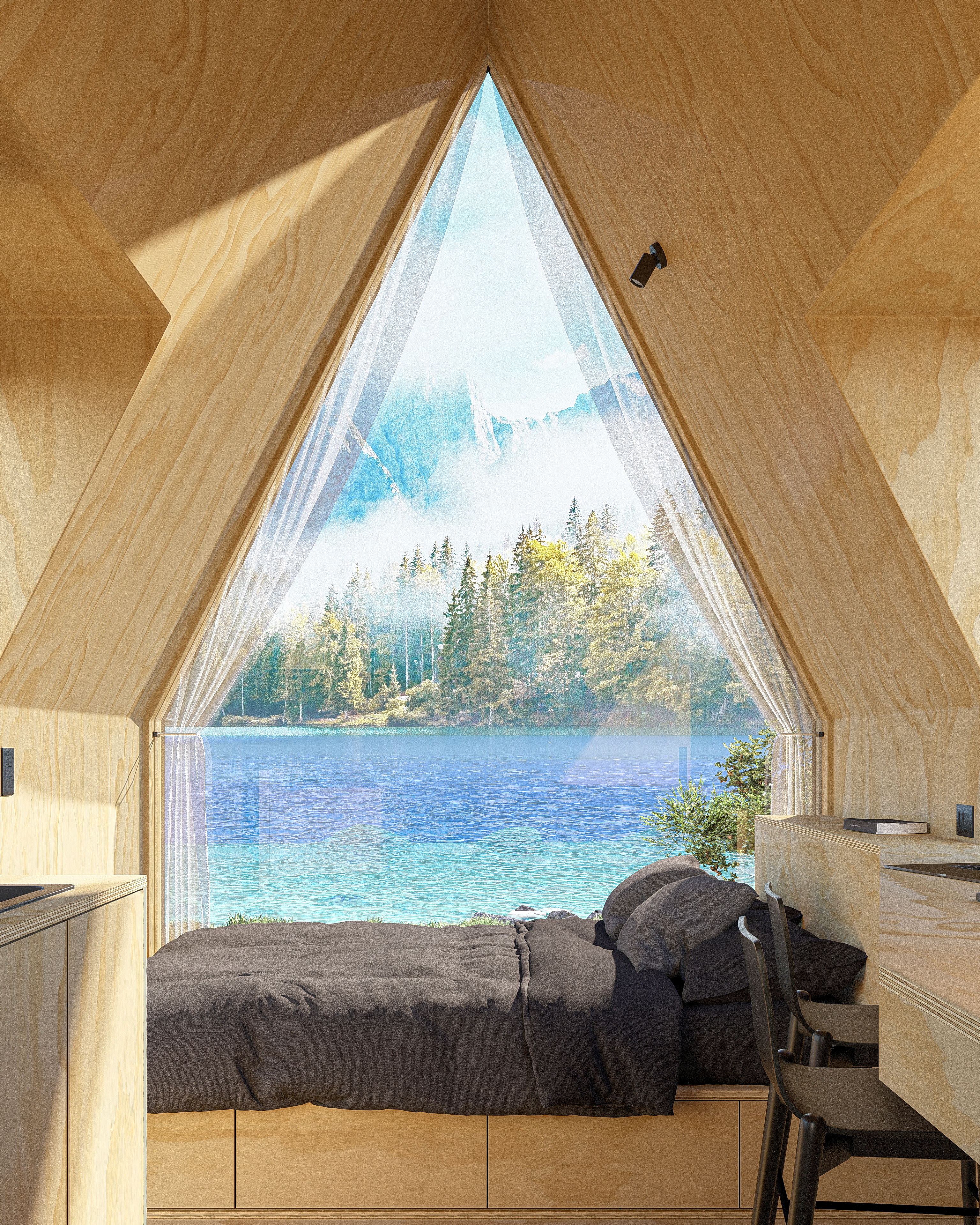 Lýsa cuenta con un dormitorio, una zona de trabajo/cocina y un baño, cada elemento y centímetro cuadrado ha sido diseñado y optimizado con precisión para garantizar funcionalidad y comodidad.