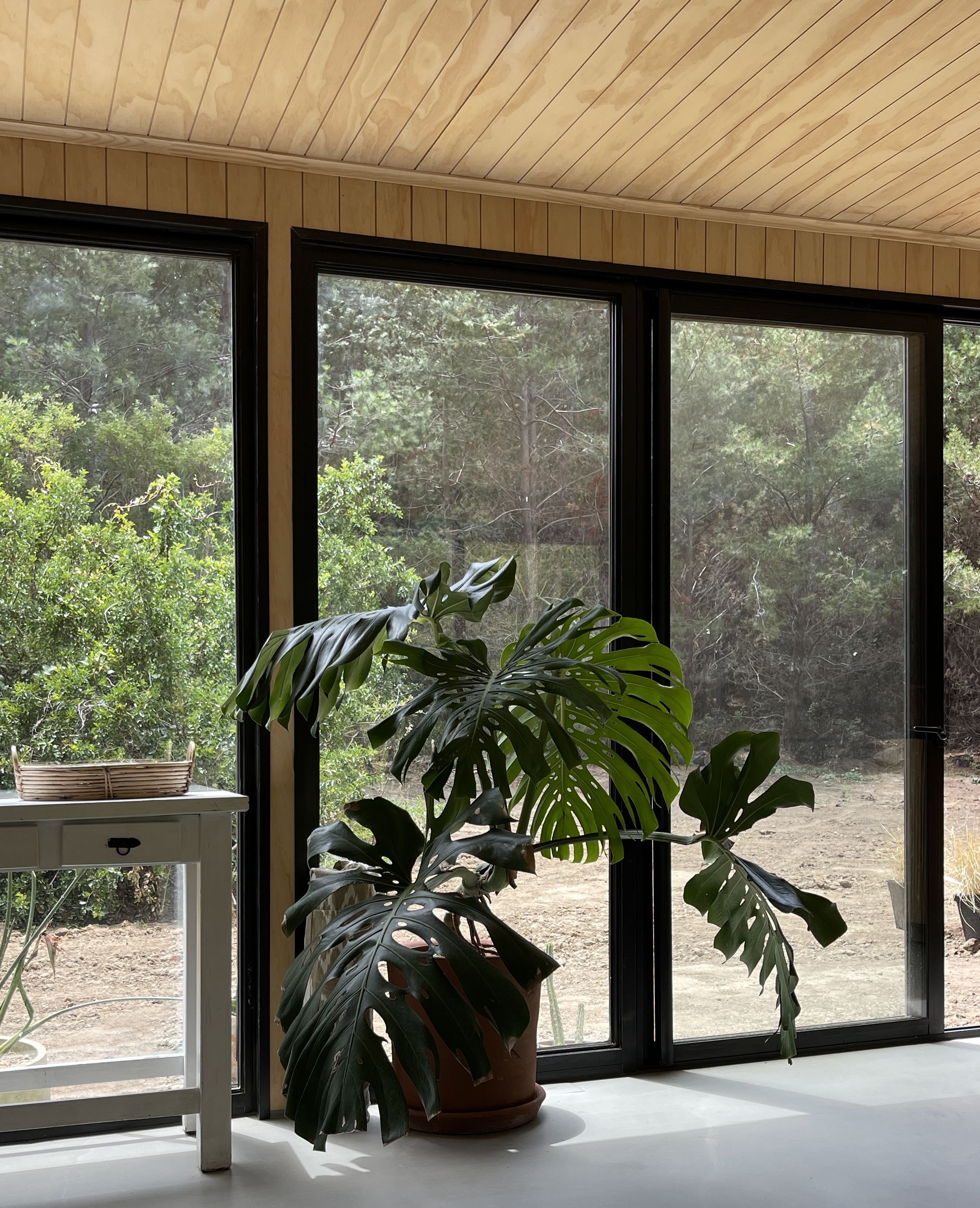 Emplazado en medio de una reserva natural, este proyecto consta de dos módulos de 40 m2 desfasados generando un pasillo de conexión entre ellos.