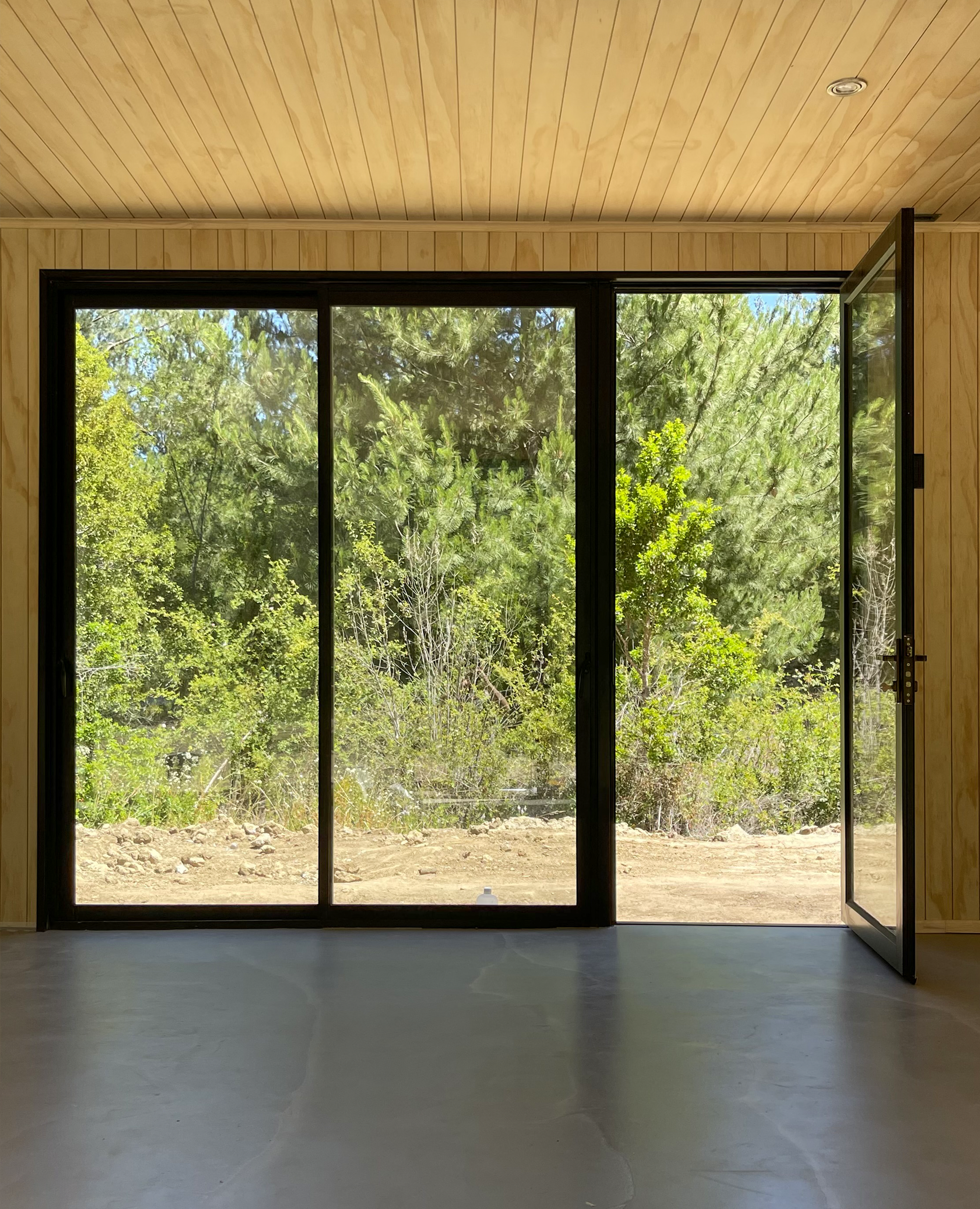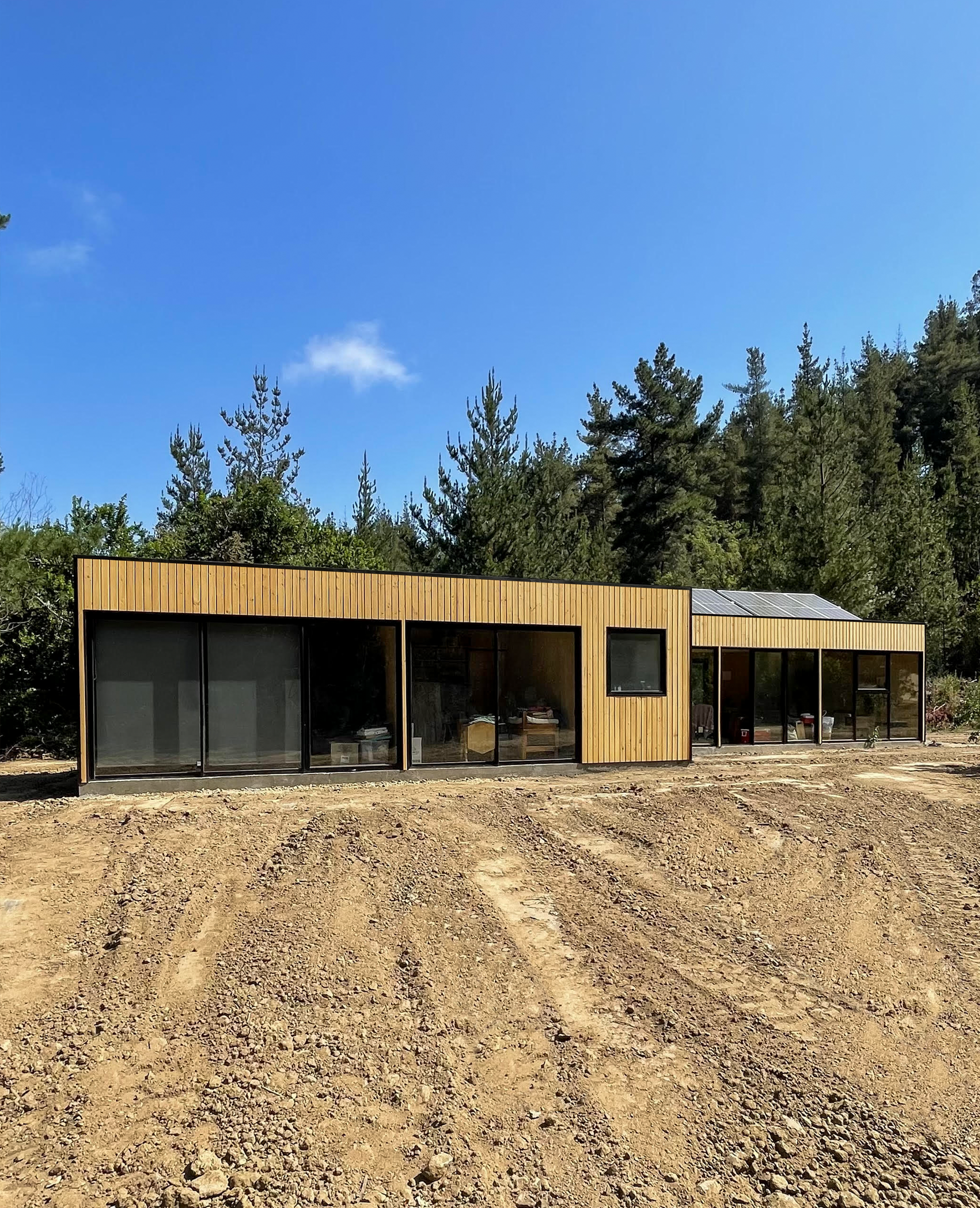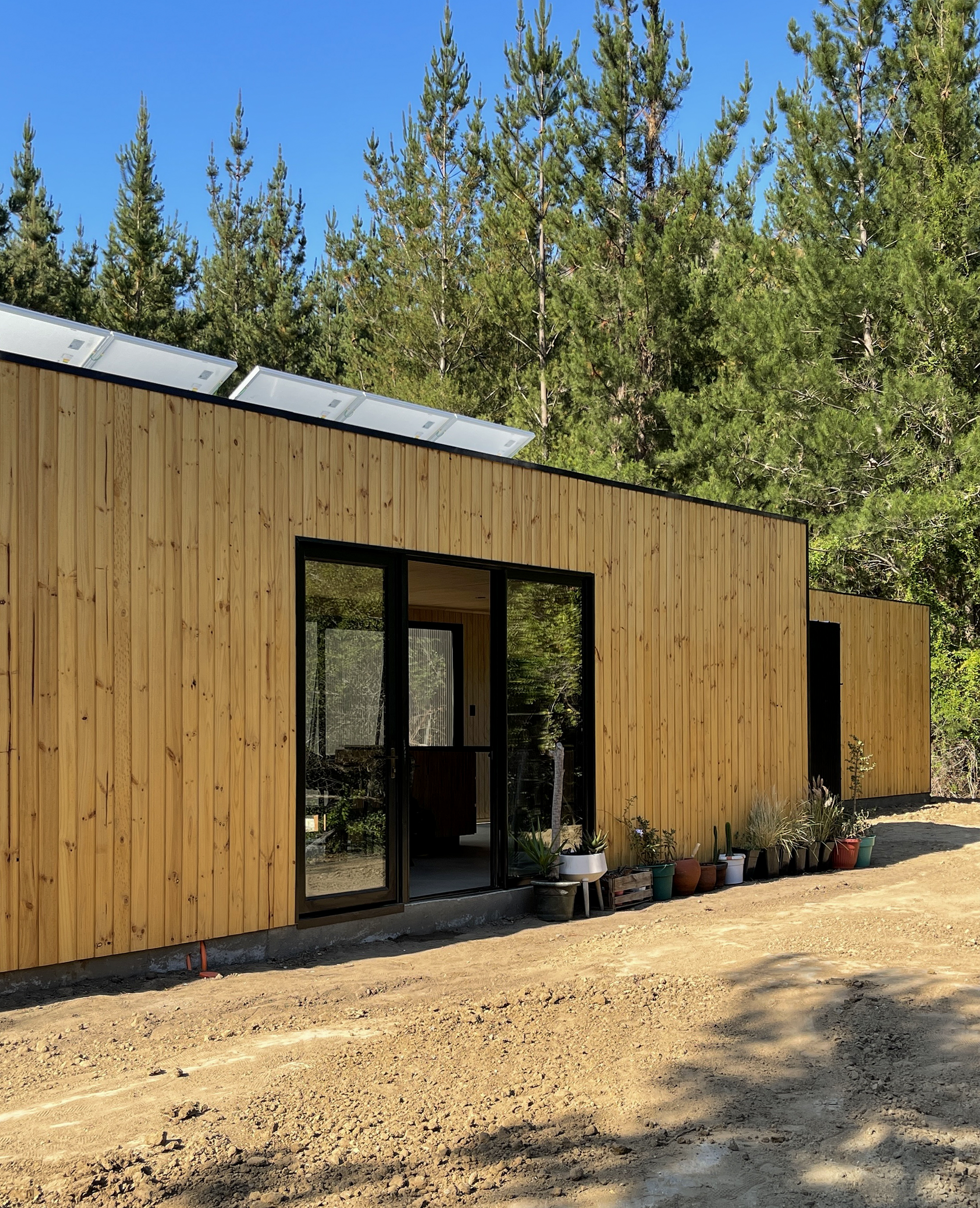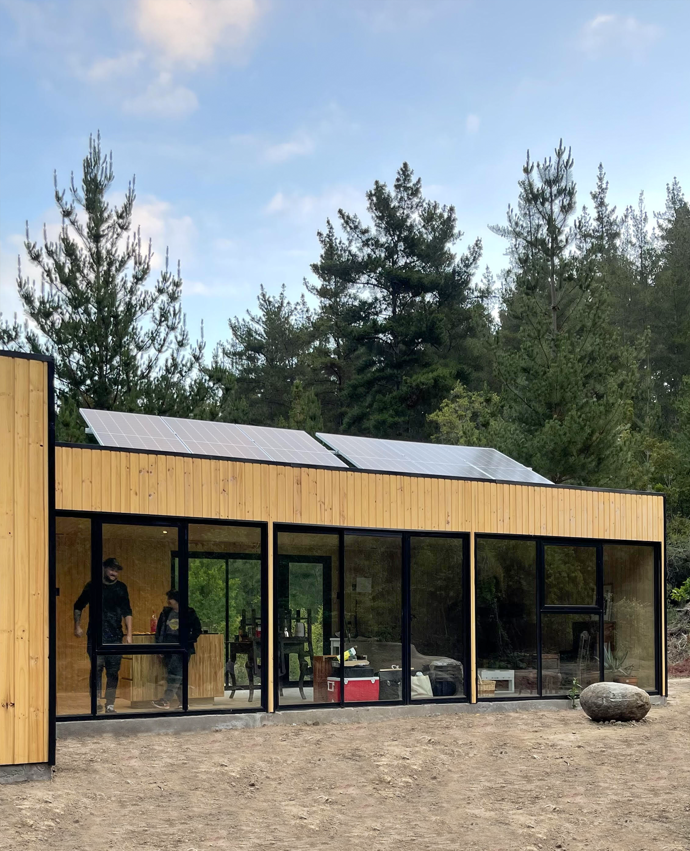 Vivienda proyectada en estructura de acero, aislada térmica y acústicamente, revestimiento exterior en madera y zinc microondulado color negro, revestimiento interior de pino machihembrado vitrificado, ceramicas en baño (s) y muro de cocina, cristales termopanel con perfileria color negro AL 25 reforzado.