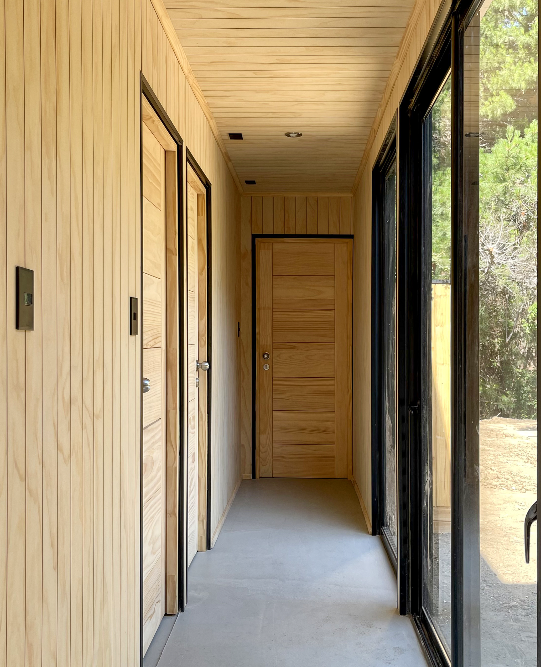 En un módulo se encuentra el estar, comedor y cocina acompañados de una vista completa del entorno, gracias a su frente completo de cristales termopanel, el otro módulo contiene dos dormitorios y un baño.