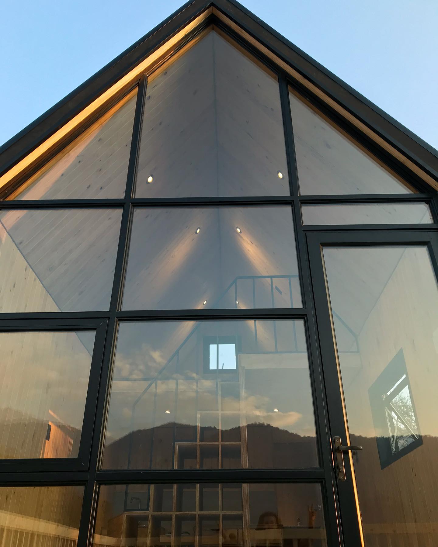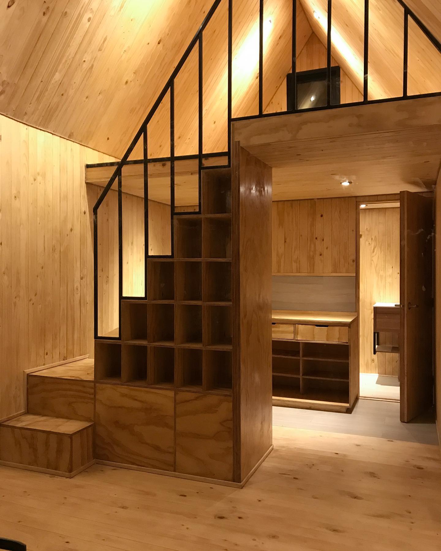 Refugio de geometría simple y gran apertura frontal, diseñado para volcarse por completo hacia el paisaje. Un espacio compacto, cálido y preciso, donde la madera, la altura interior y la luz natural construyen una atmósfera clara y serena.
