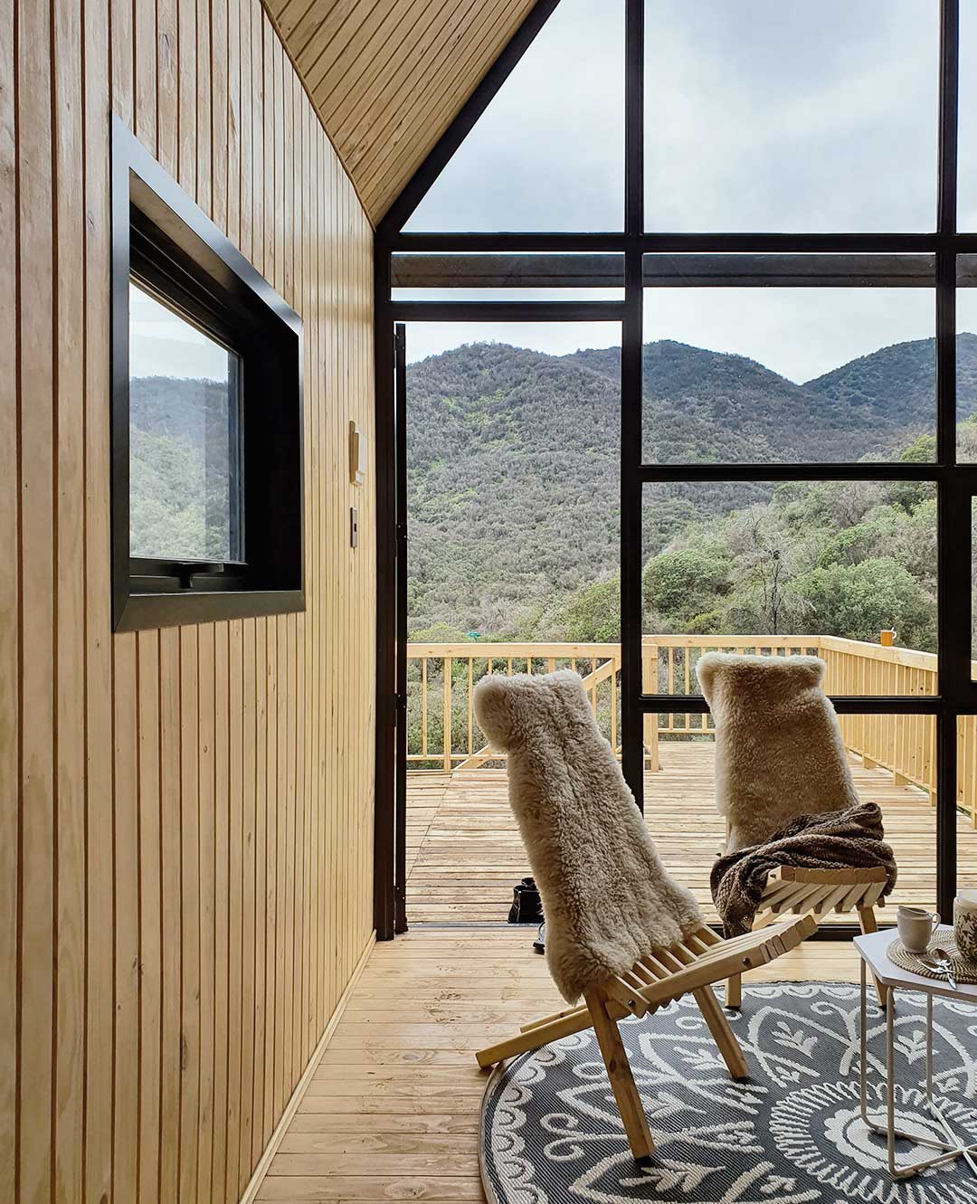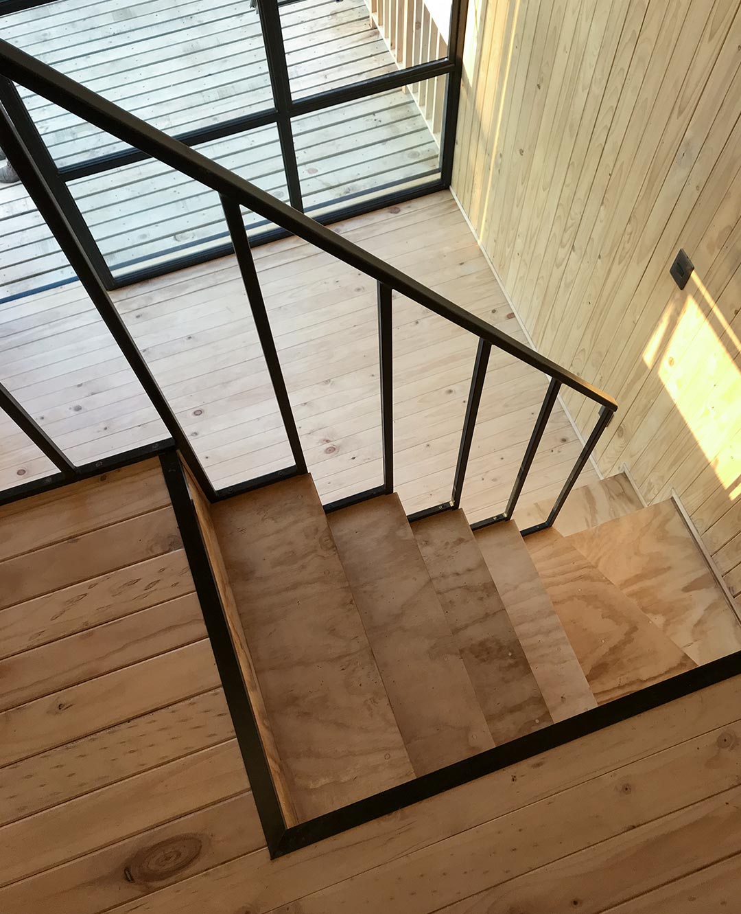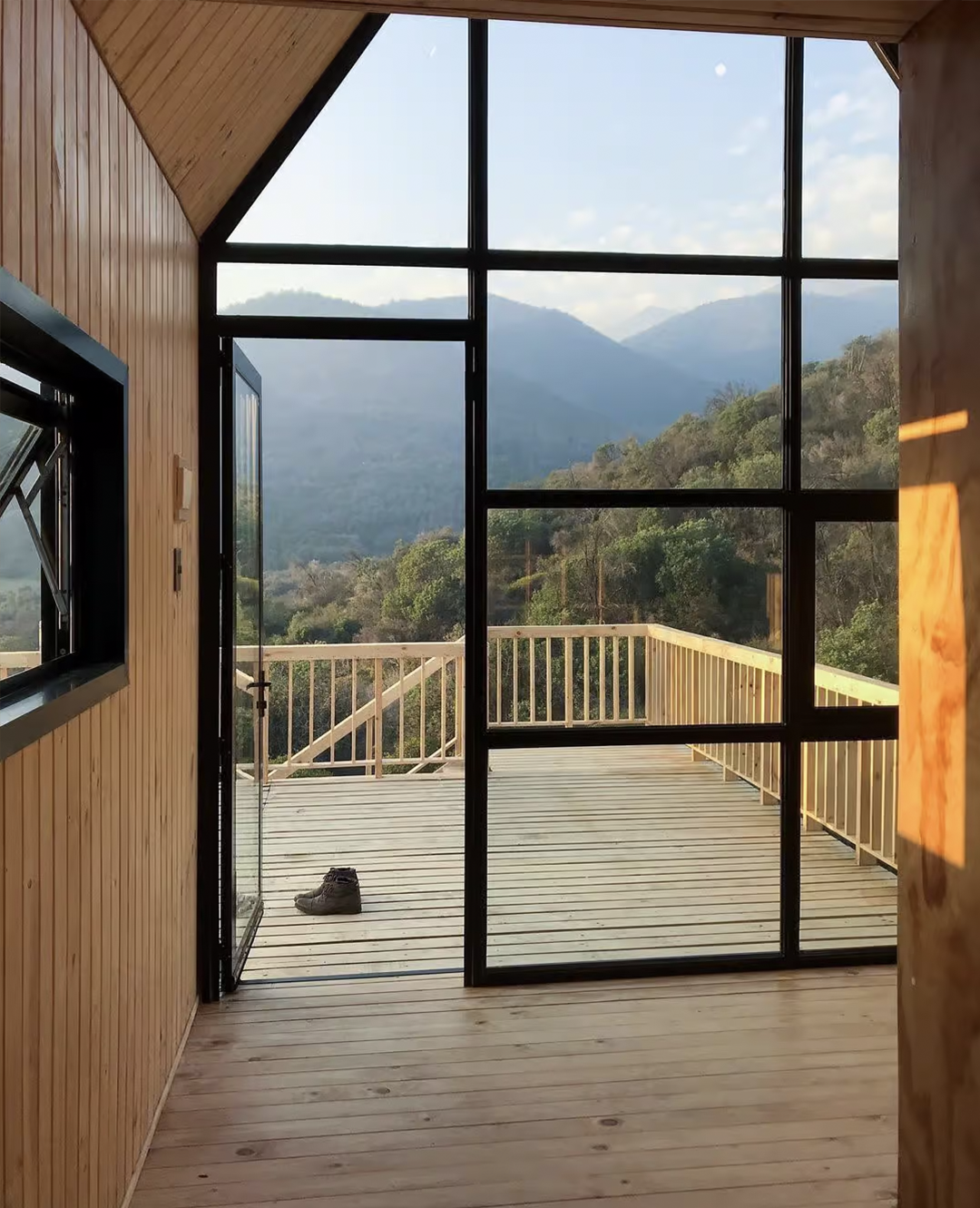 Vivienda fabricada con estructura de madera, aislada térmica y acústicamente, revestimiento exterior zinc microodulado color negro, revestimiento interior de pino machihembrado vitrificado, ceramicas en baño y muro de cocina, cristales termopanel con perfileria color negro AL 25 reforzado.