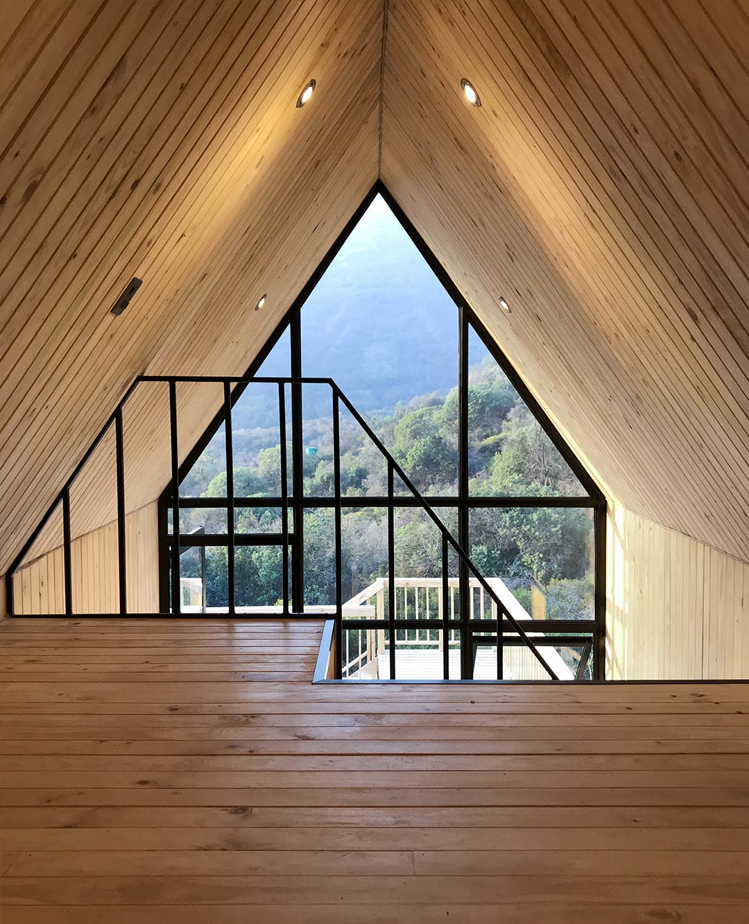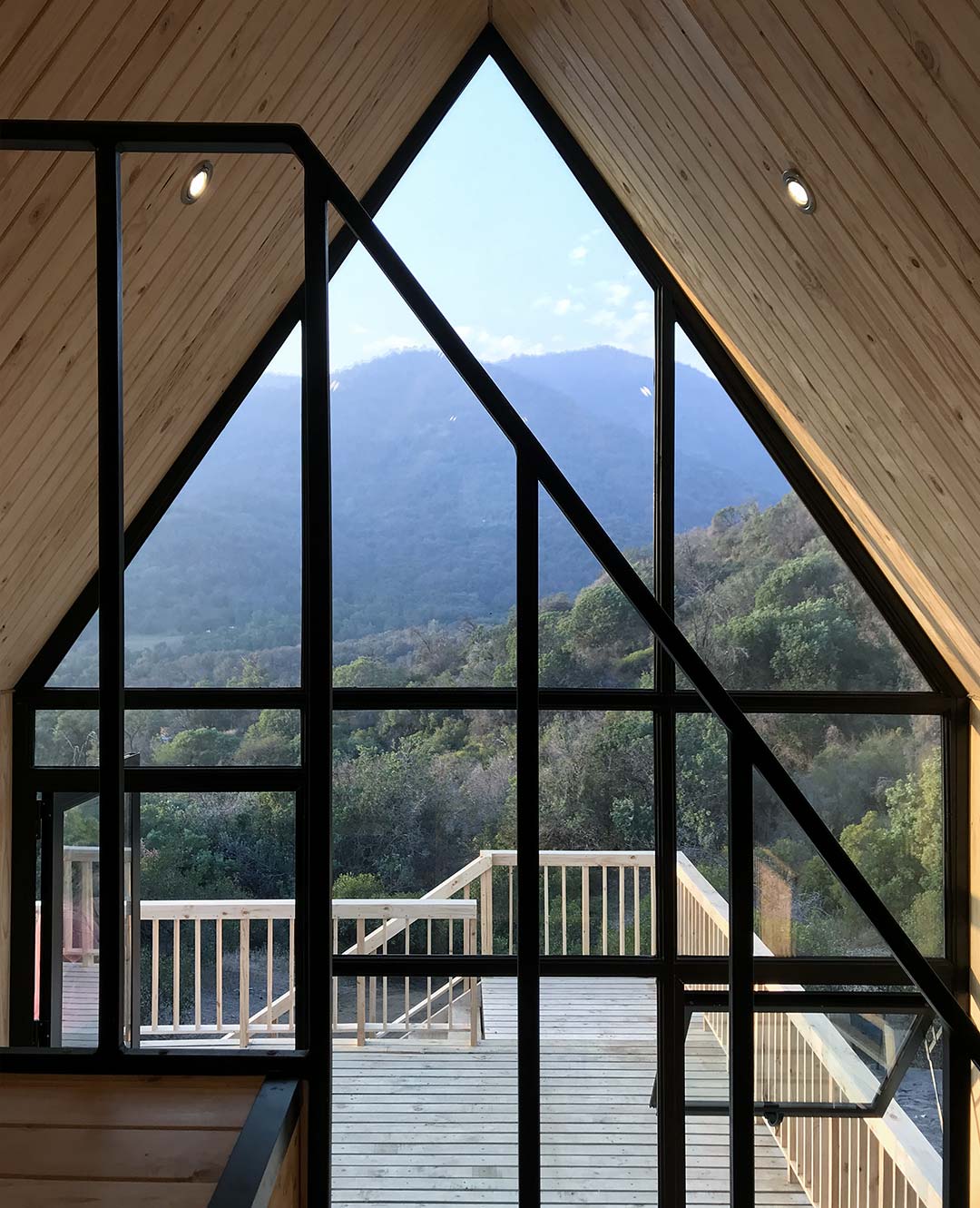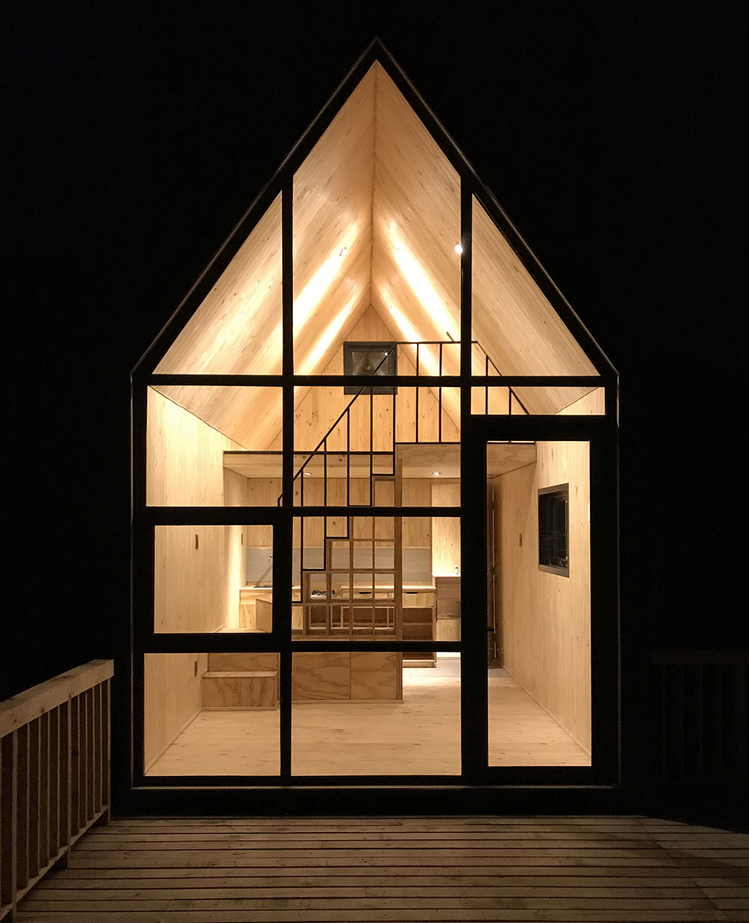 Vivienda fabricada con estructura de madera, aislada térmica y acústicamente, revestimiento exterior zinc microodulado color negro, revestimiento interior de pino machihembrado vitrificado, ceramicas en baño y muro de cocina, cristales termopanel con perfileria color negro AL 25 reforzado.