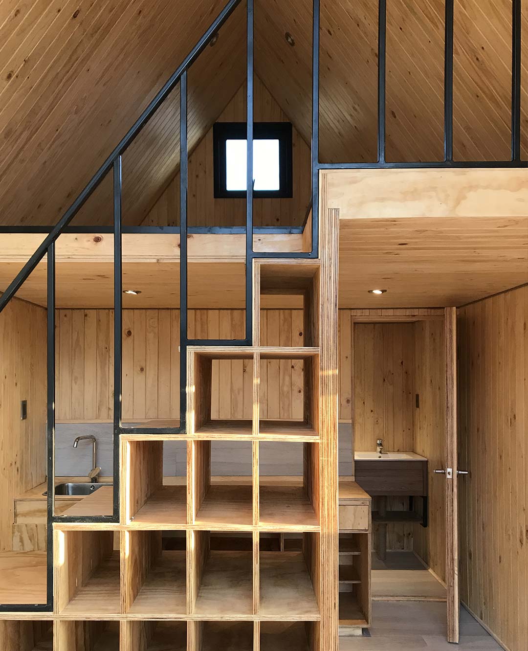 Este modelo esta compuesto por 1 altillo con escalera multifunción, 1 baño,  estar y cocina integrada + terraza.
