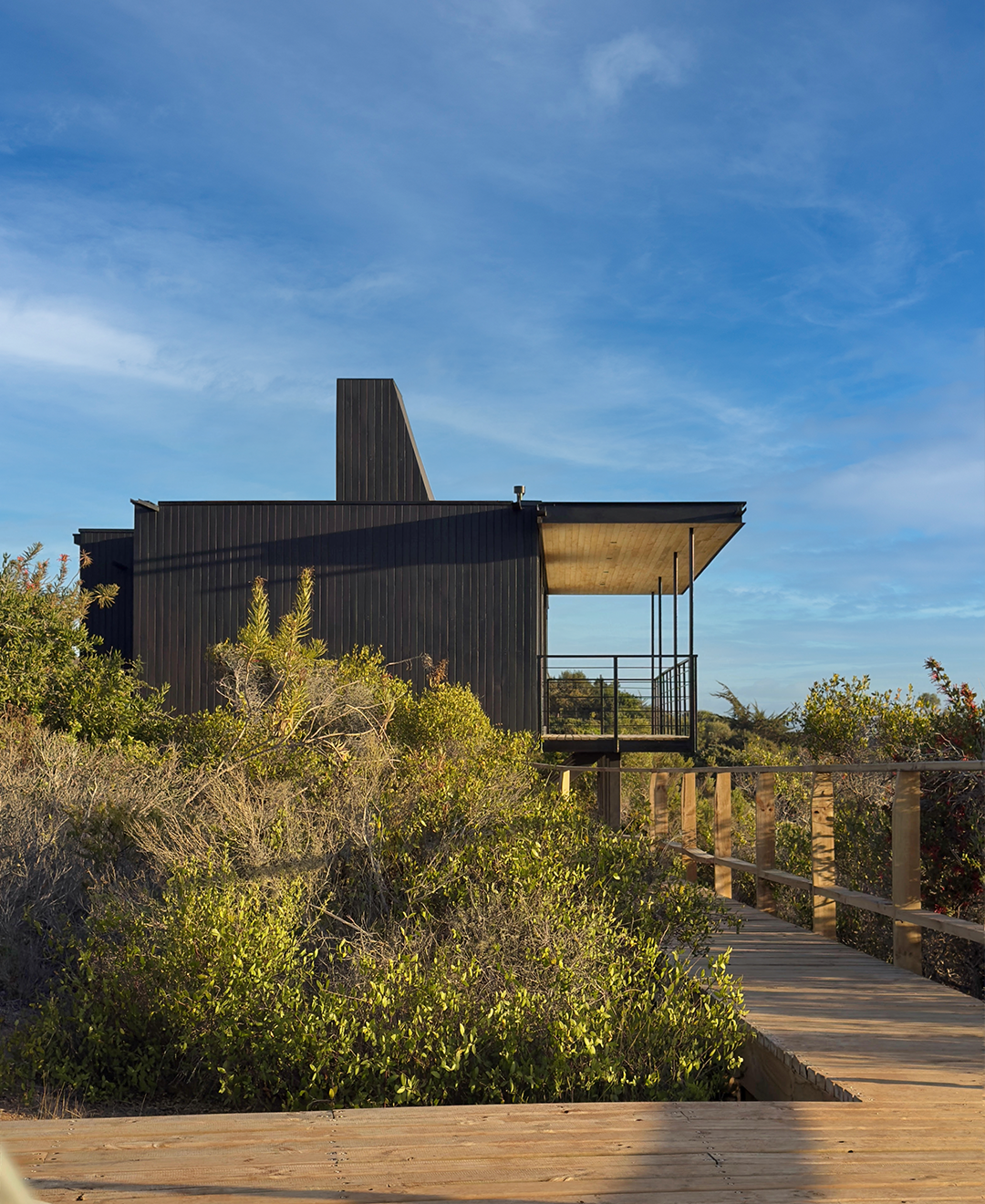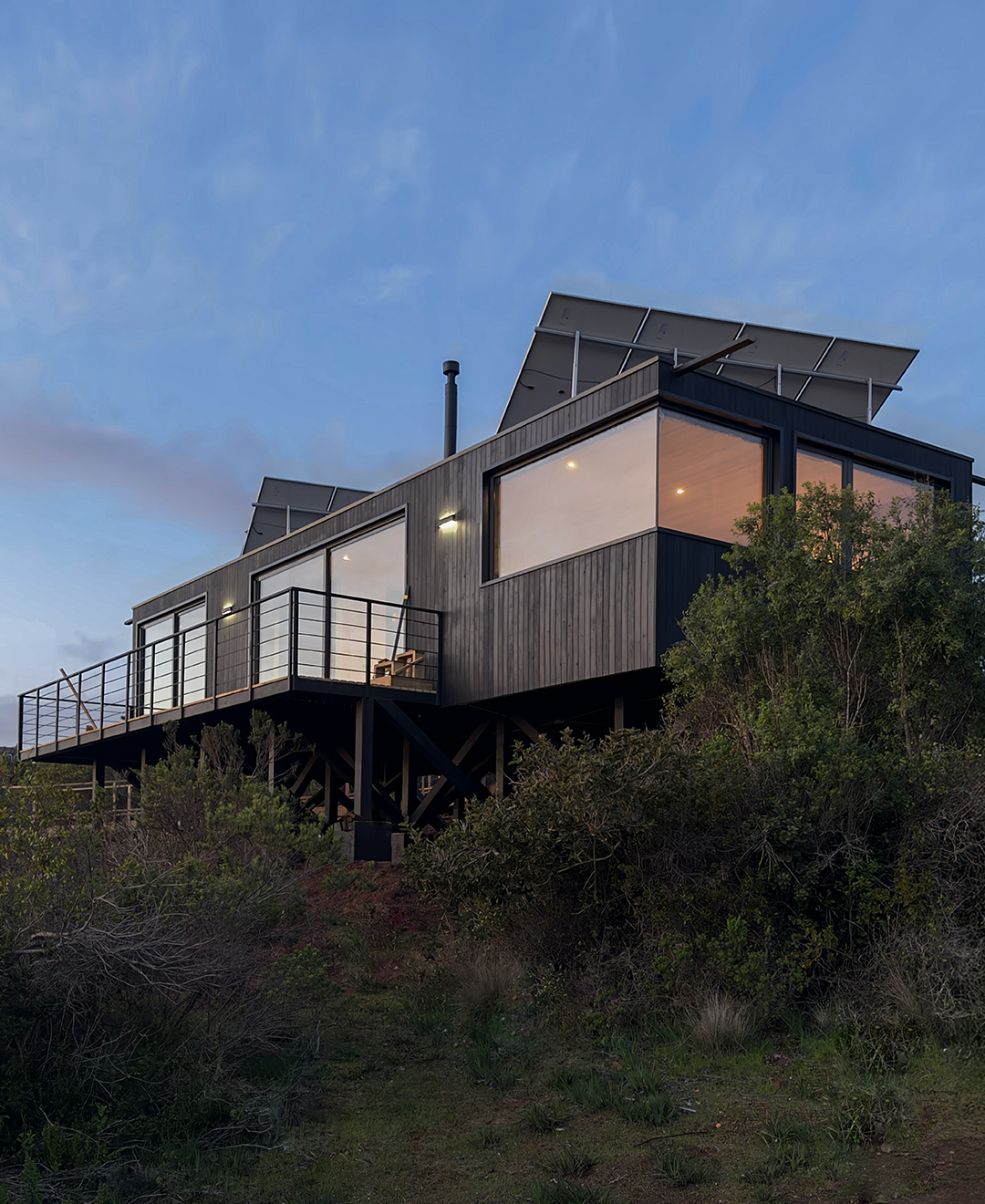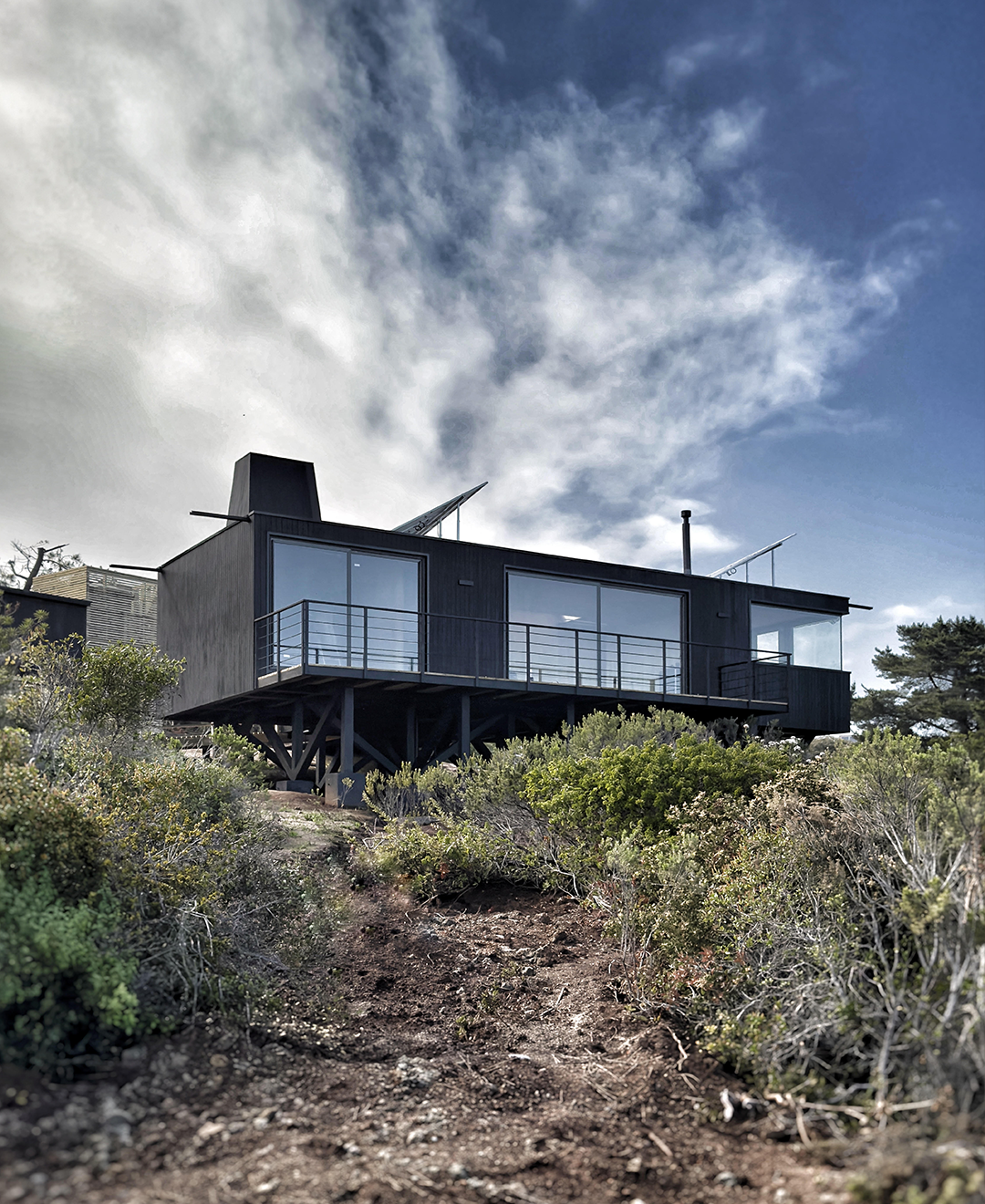 Dos volúmenes conectados ordenan el programa con claridad, separando áreas privadas y comunes. Elevada sobre pilotes, con estructura expuesta, terrazas abiertas y una envolvente sobria, la vivienda responde a la pendiente sin forzarla y convierte las vistas en parte central de la experiencia interior.