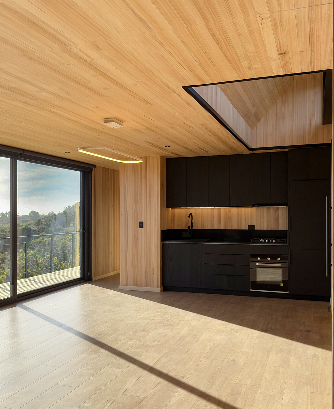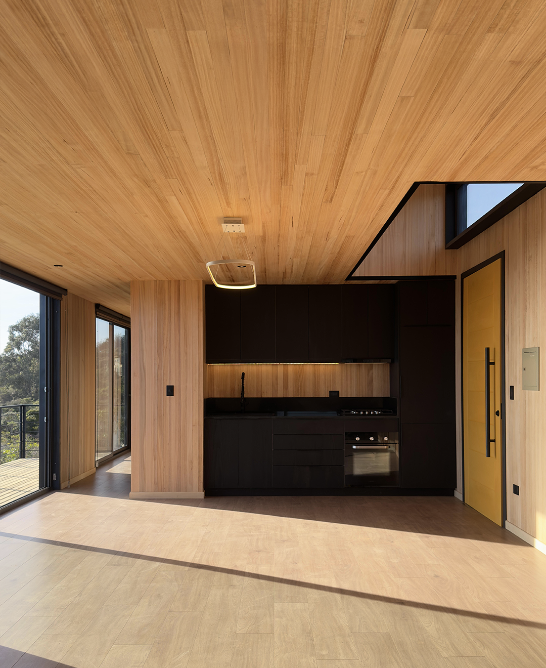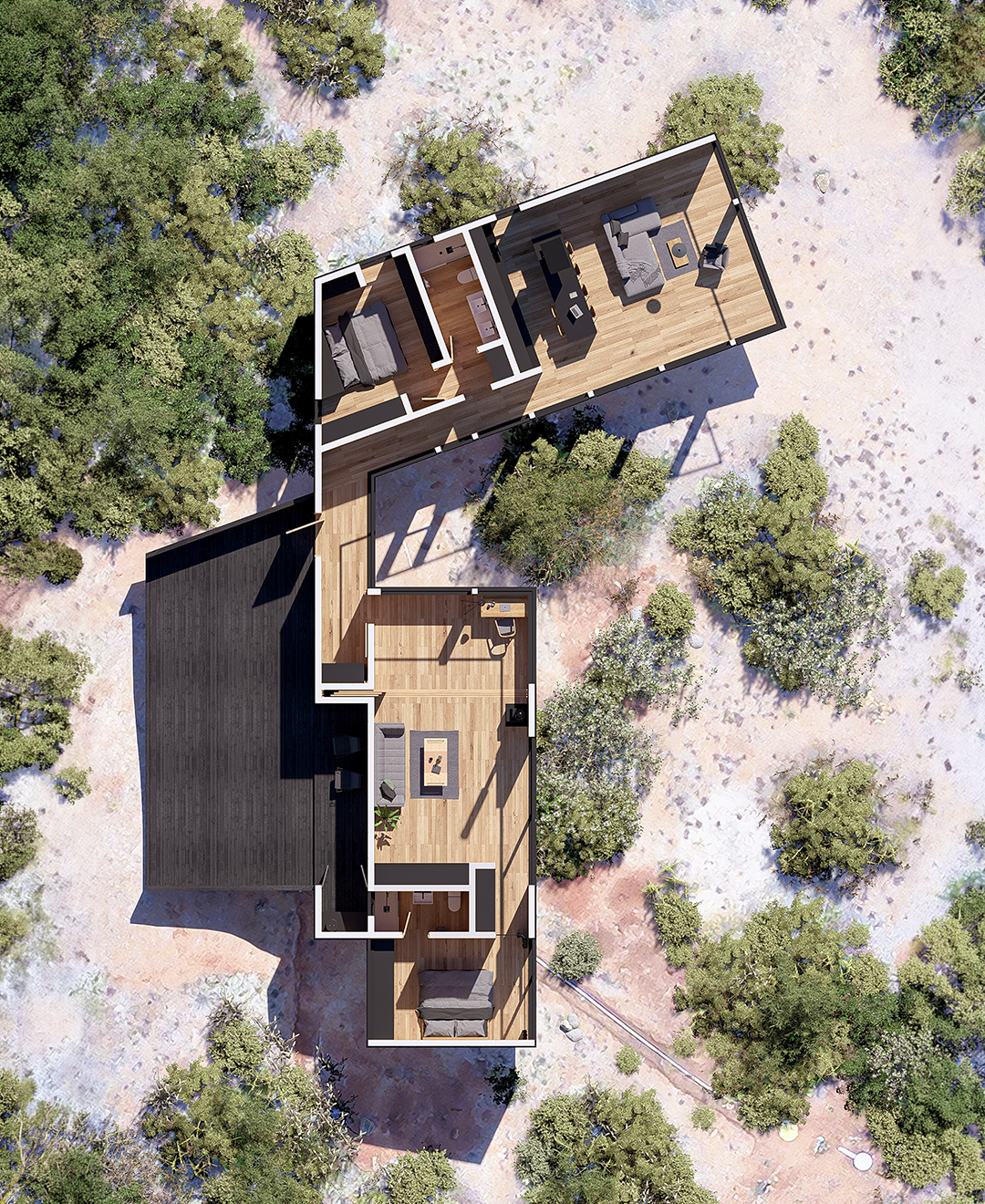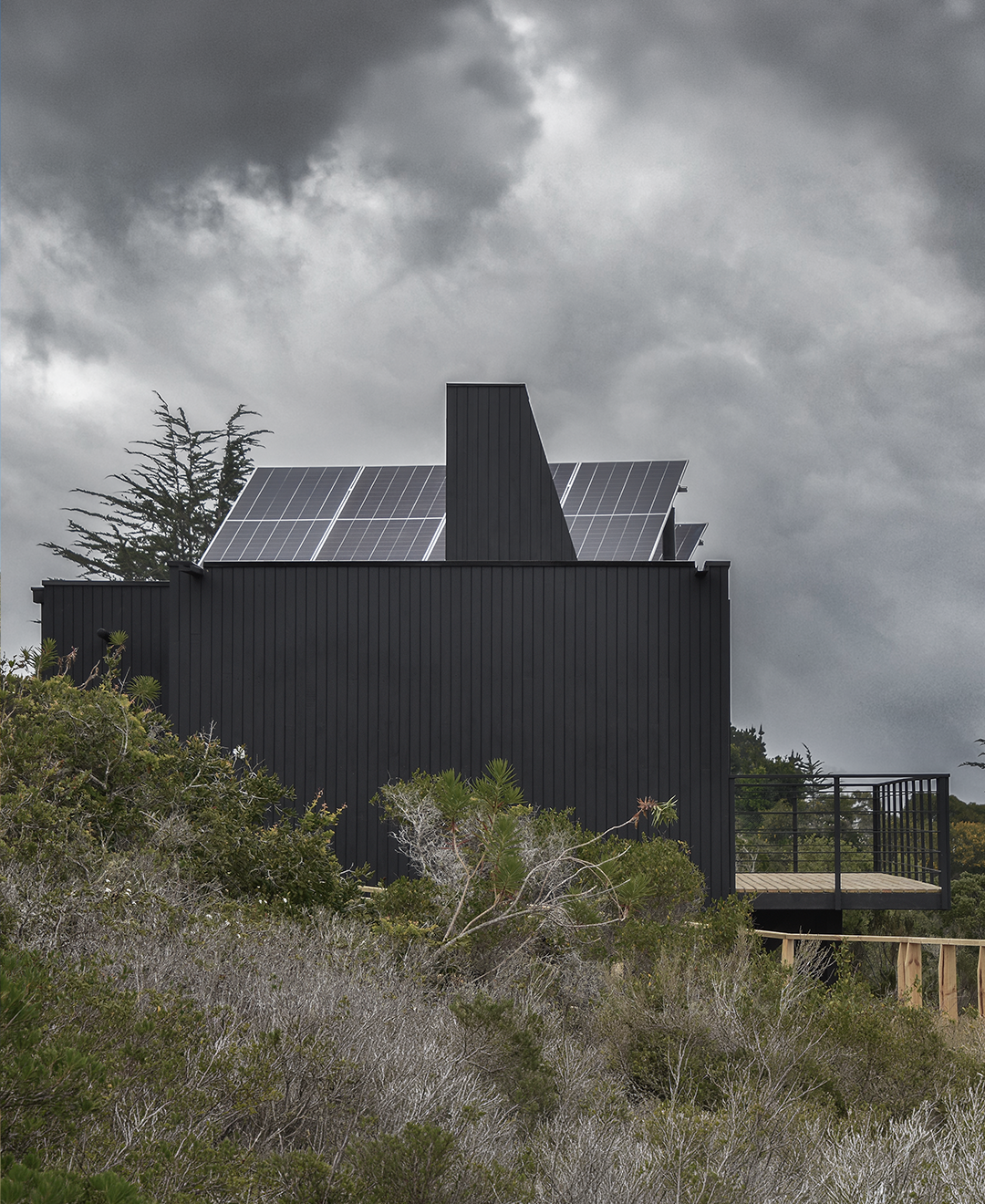 Dos volúmenes conectados ordenan el programa con claridad, separando áreas privadas y comunes. Elevada sobre pilotes, con estructura expuesta, terrazas abiertas y una envolvente sobria, la vivienda responde a la pendiente sin forzarla y convierte las vistas en parte central de la experiencia interior.